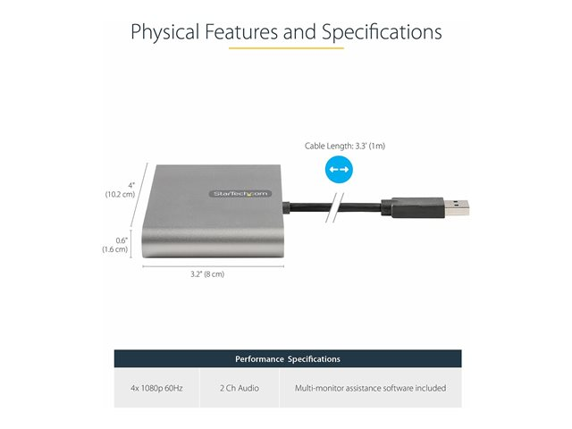 StarTech.com Adaptateur USB 3.0 vers 4x HDMI - Carte Vidéo/Graphique Externe - Adaptateur USB Type-A vers Quadruple HDMI 1080p 60Hz - Convertisseur USB A vers HDMI - Windows Uniquement (USB32HD4) - Câble adaptateur - USB type A mâle pour HDMI femelle - 1 m - gris sidéral - support 1080 p 60 Hz